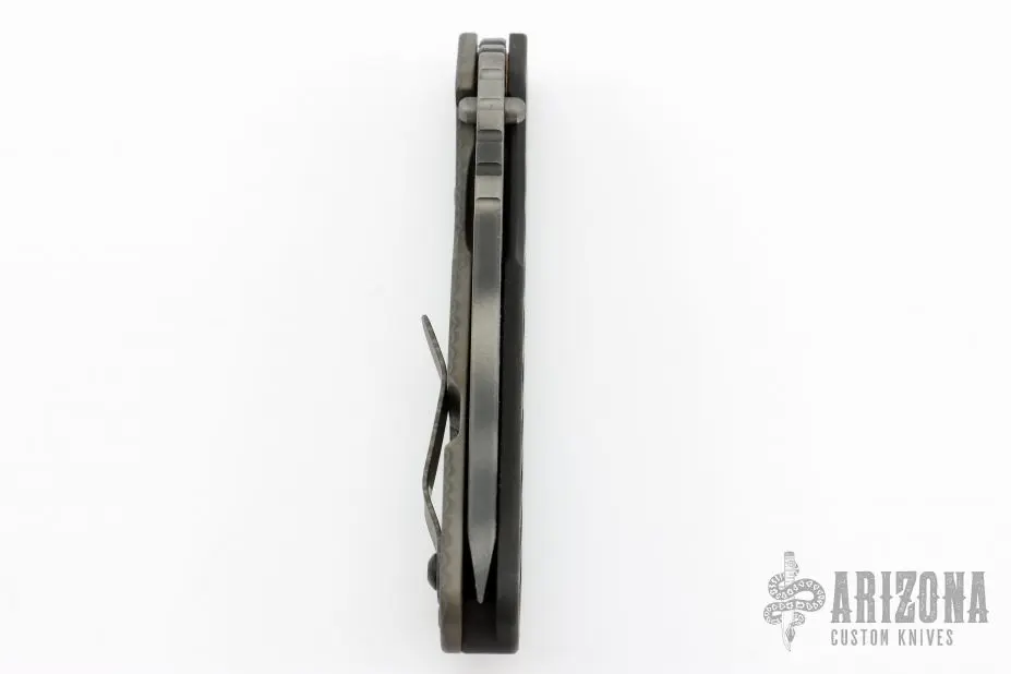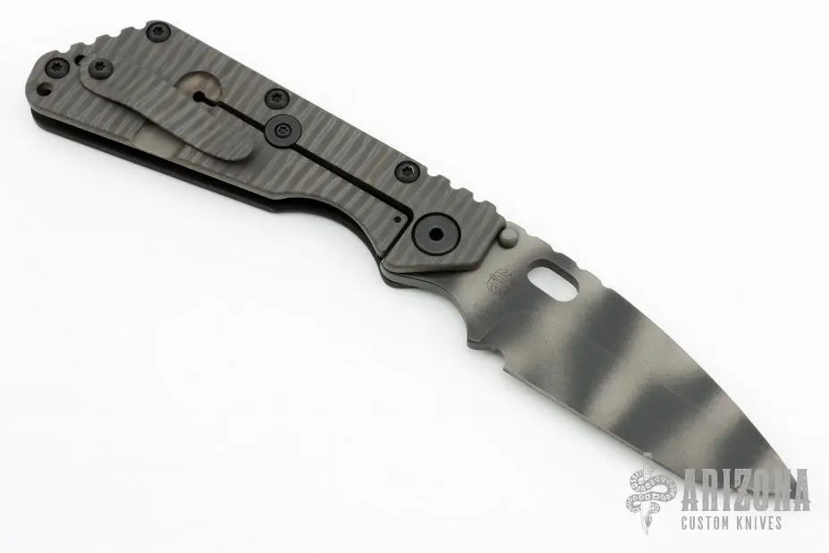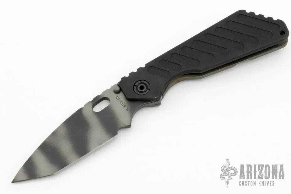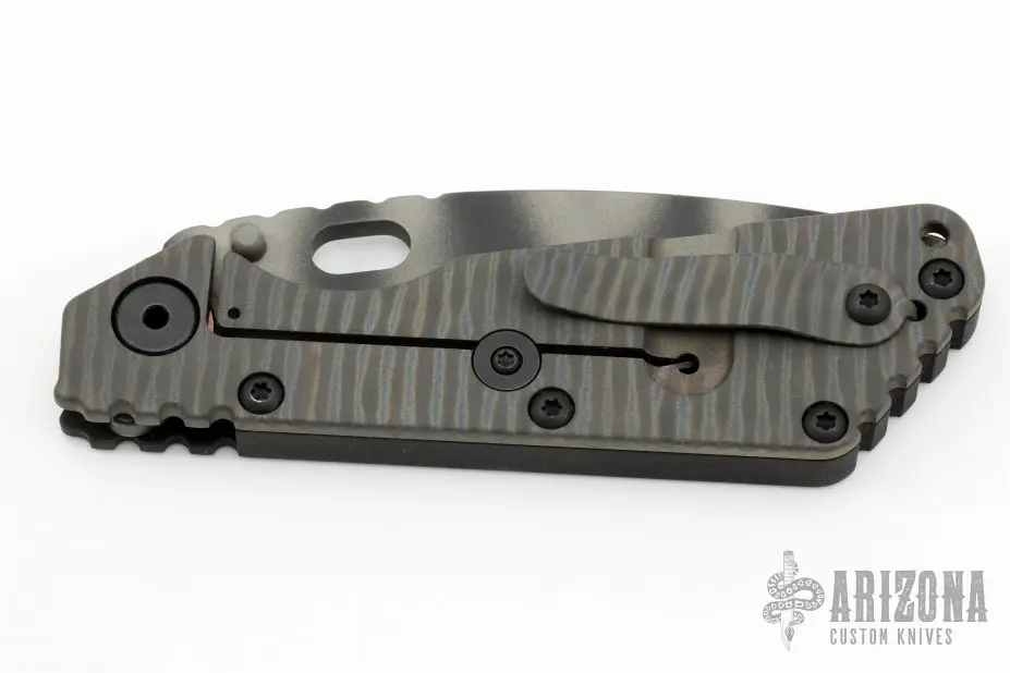 This Mick Strider SMF Fatty framelock folder features a tiger striped tanto blade with thumbhole and notched thumbrest. The handle has a black aluminum and flamed titanium frame with titanium clip, tip up carry. Jimping on blade spine. Nice lockup, detent, and blade seating. New condition.Β
