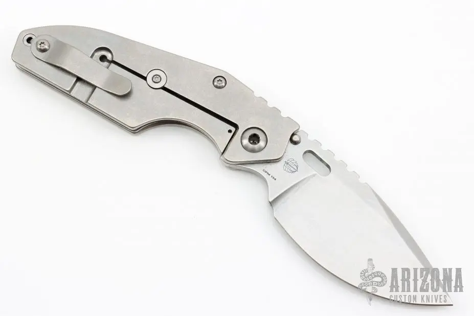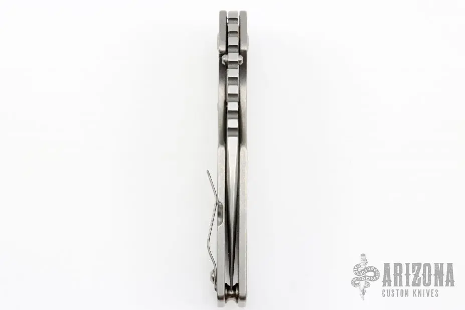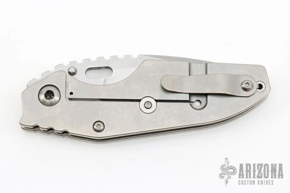 This XL Jibble by Mick Strider features a stonewashed blade with notched thumbrest and a thumbhole. The handle has a stonewashed titanium frame with tip up reversible clip. Nice detent, lockup and blade seating. New Condition. Β