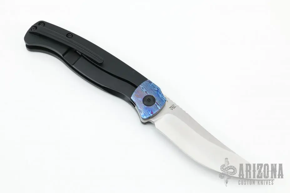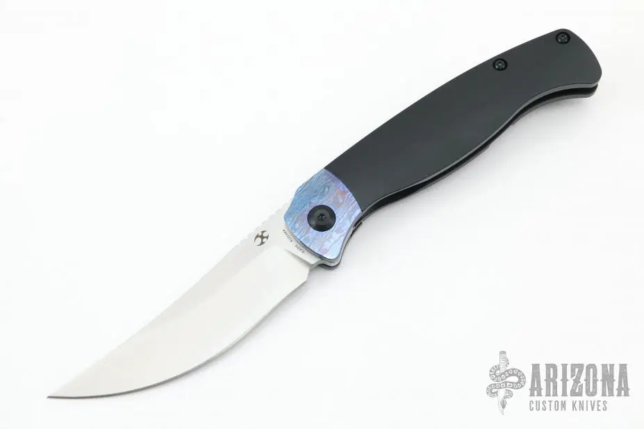 This model of the Kansept Knives Mujir features a black titanium handle with Timascus bolsters. The S20V blade has a stonewash finish.