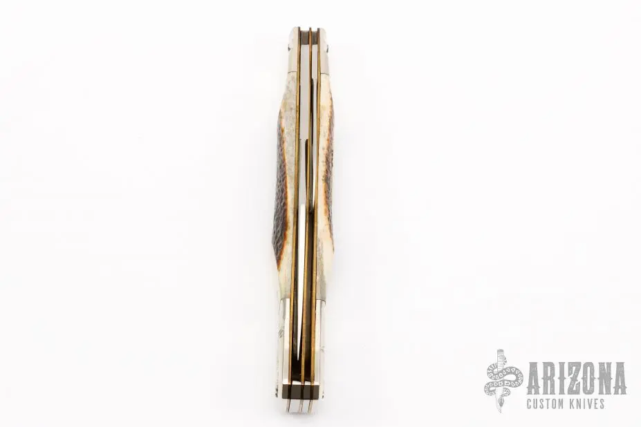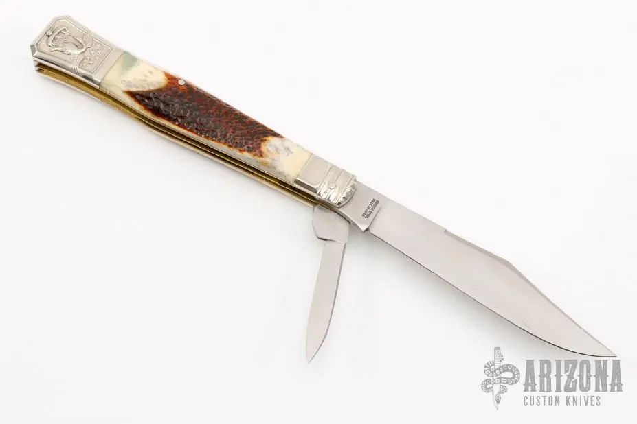 This large slipjoint with “New Orleans Knife” engraved on the blade. Nickel silver bolsters, stag scales, brass liners, stainless steel springs. Comes with original box. Excellent condition.