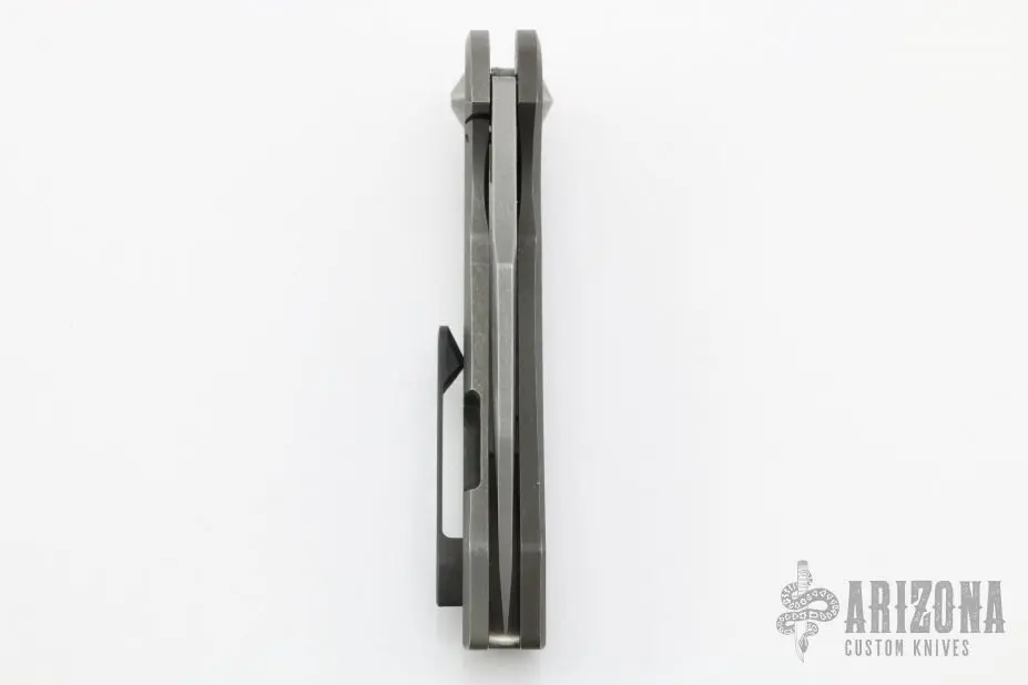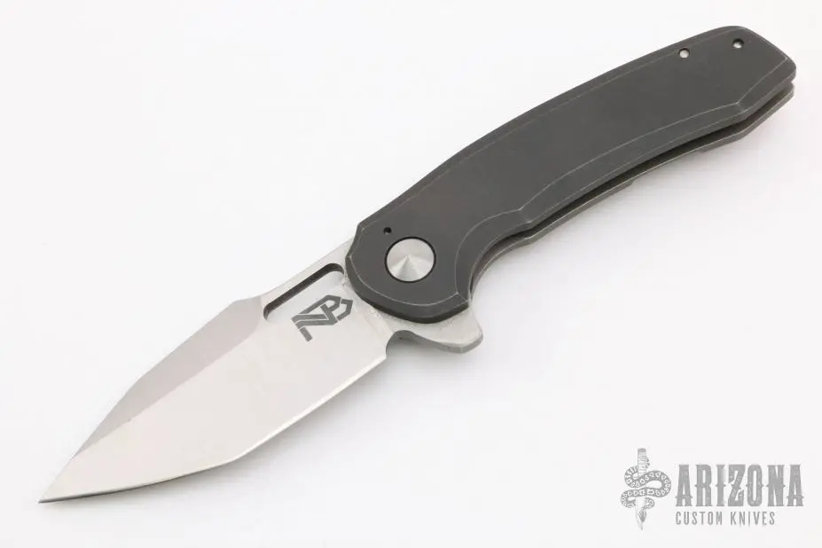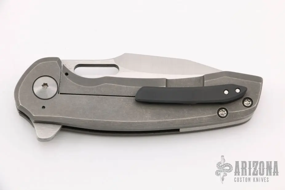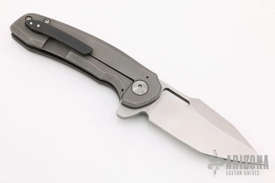 This flipper by Nova Blades features a lightly stonewashed harpoon style blade, thumbhole, notched thumbrest and flipper. The handle has a tumble finished titanium frame with a zirconium tip up clip and a titanium backspacer. Rides on bearing, nice detent, lockup and blade seating. Comes with padded case. Excellent Condition.