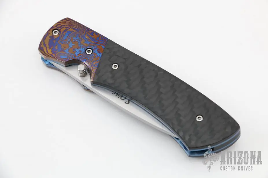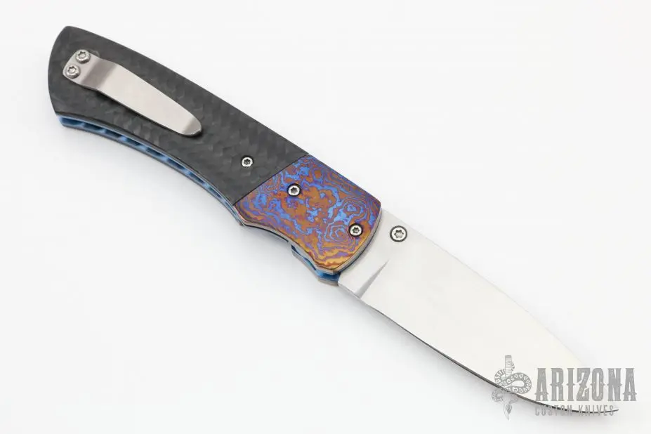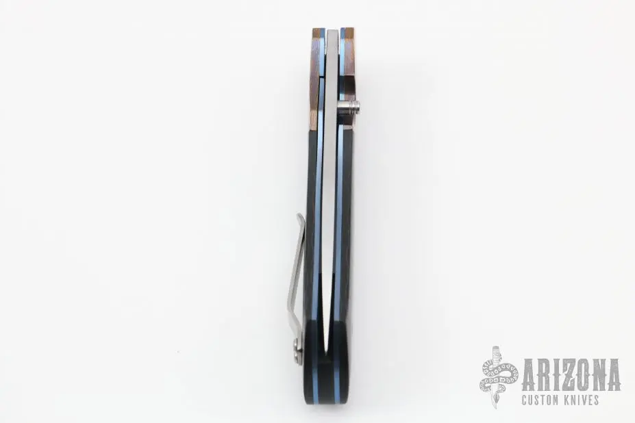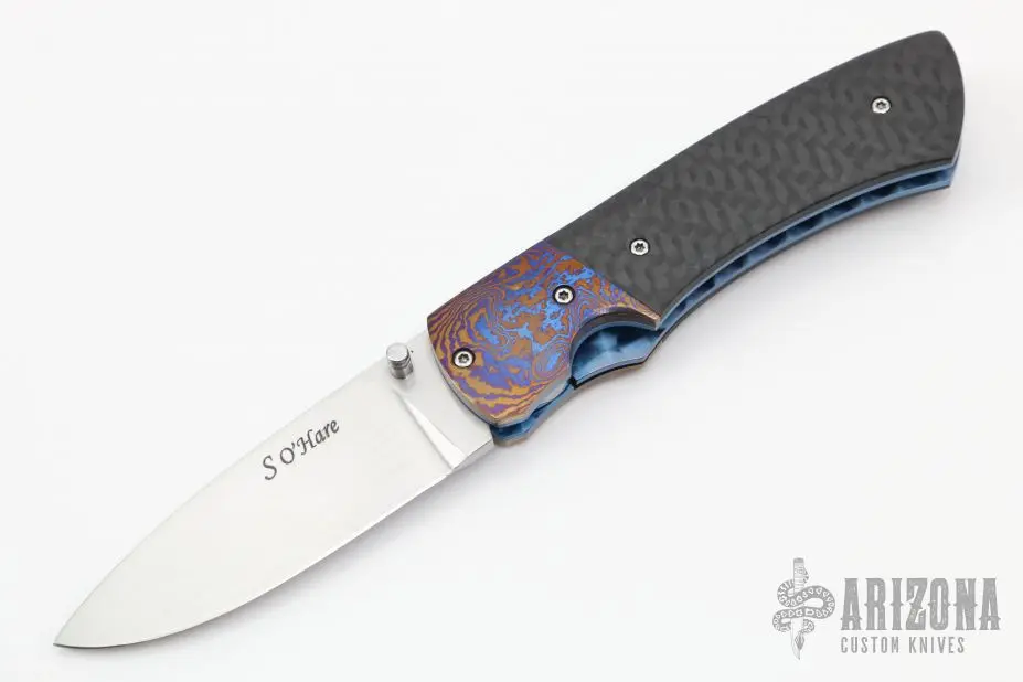 This linerlock folder by Sean O’Hare features a hand rub satin finished blade with a single thumbstud. The handle hasTimascus bolsters, carbon fiber scales, anodized titanium liners with jeweled interiors, tip up satin finish titanium clip, g10 backspacer. Smooth action. Nice blade seating, detent, and lockup. Very nice work. Has some light scuffs and scratches on the clip and bolsters, Excellent condition otherwise.Β