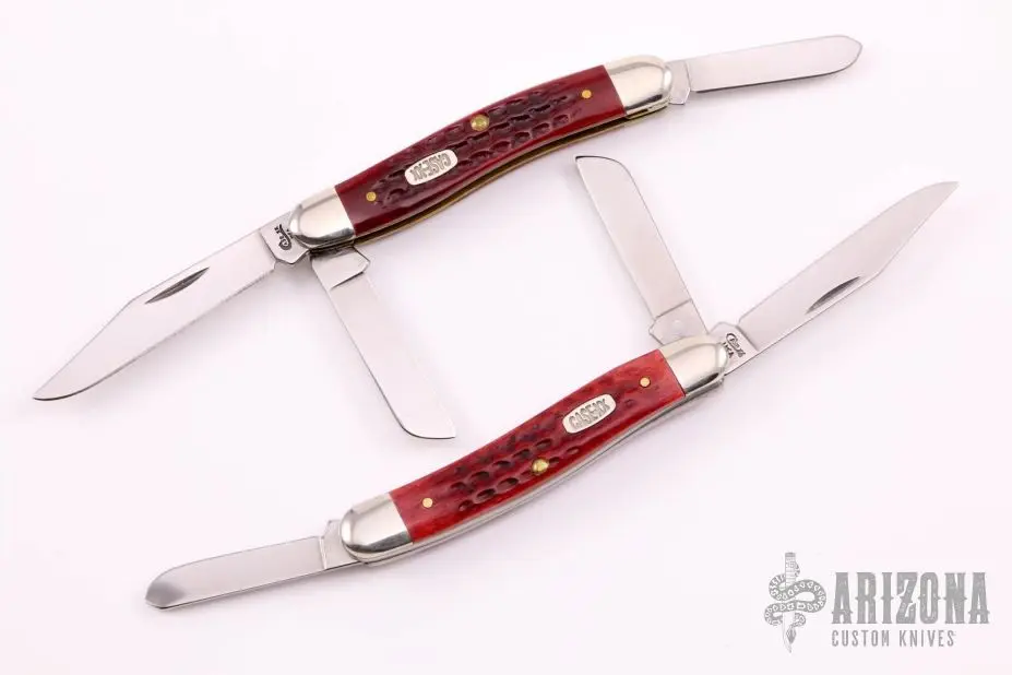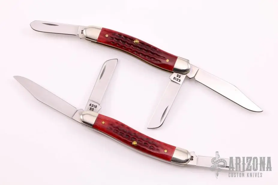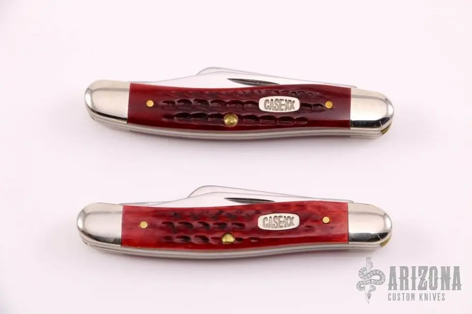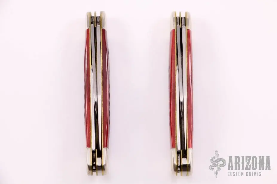 This pair of Stockmans by Case both have 3 mirror polished blades with nail nicks. Nickel silver bolsters, red jigged bone scales, brass liners, stainless springs. They both Excellent condition.