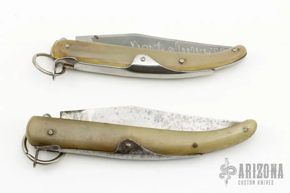 These Vintage Navajas feature clip point blades with nail nicks. The handles are horn with a steel spring and ring lock mechanism. Has some scratches and patina, otherwise good condition for their age.