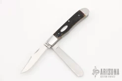 This slipjoint by Eugene Shadley features 2 hand rub satin finished blades with nail nicks. The handle has mirror finished stainless steel bolsters with integral liners, jigged bone covers with a stainless steel escutcheon, stainless steel liners and springs. Excellent condition. #808 on the blade. Comes with a zippered case.