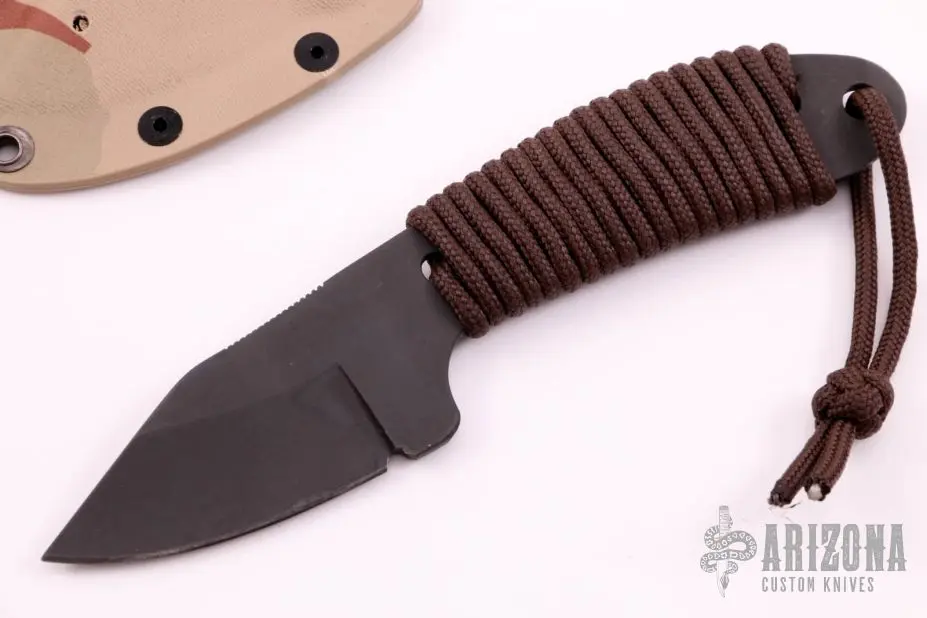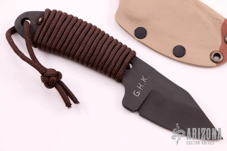This Pocket Bowie by GHK features a black oxide clip point blade with notched thumbrest, Sandvic Stainless Steel, .179″ blade stock and 1.330″ blade depth, full tang construction with cord wrapped grip, lanyard hole. Comes with a kydex sheath. New from maker.