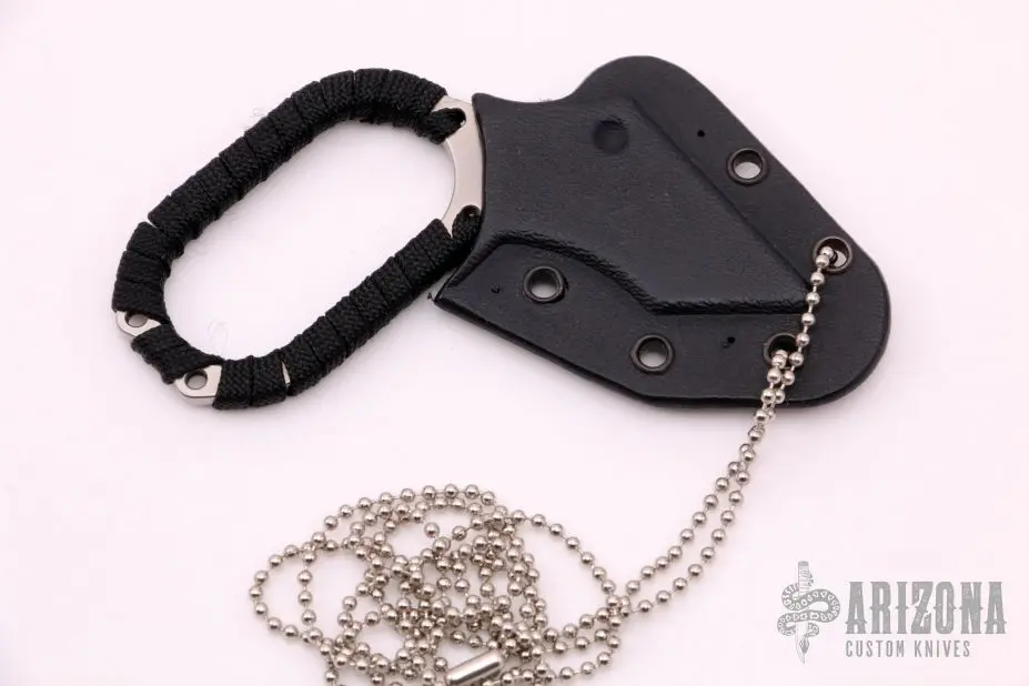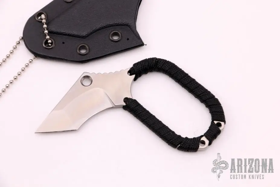 This Polished Hybrid by Hideaway Knives features a satin finished tanto recurve blade with notched thumbrest and cord wrapped grip, .130″ blade stock and 1.010″ blade depth, full tang construction. Comes with a kydex neck sheath and original packaging. New from maker.