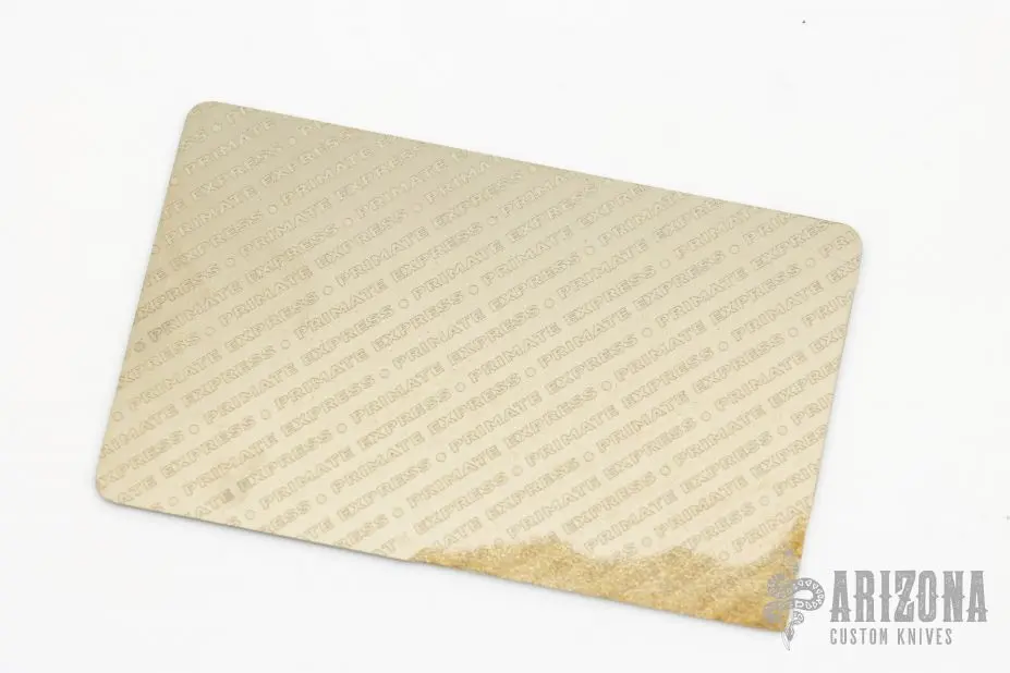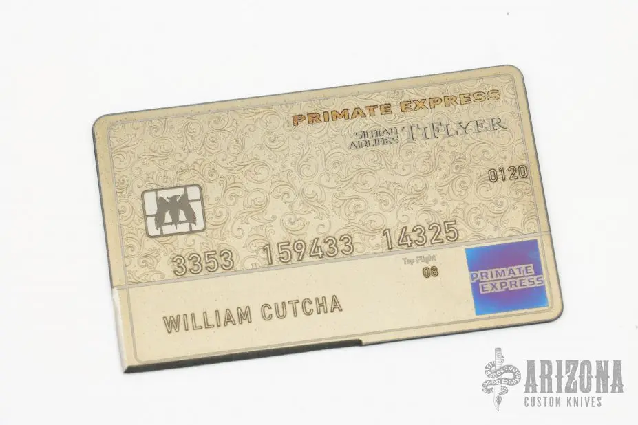 Primate Express Titanium Card Blade by Mummert Knives. Has Fiber Laser Color and Deep Etch. Tungsten carbide edge, RC 72. Comes with original packaging. Excellent condition.