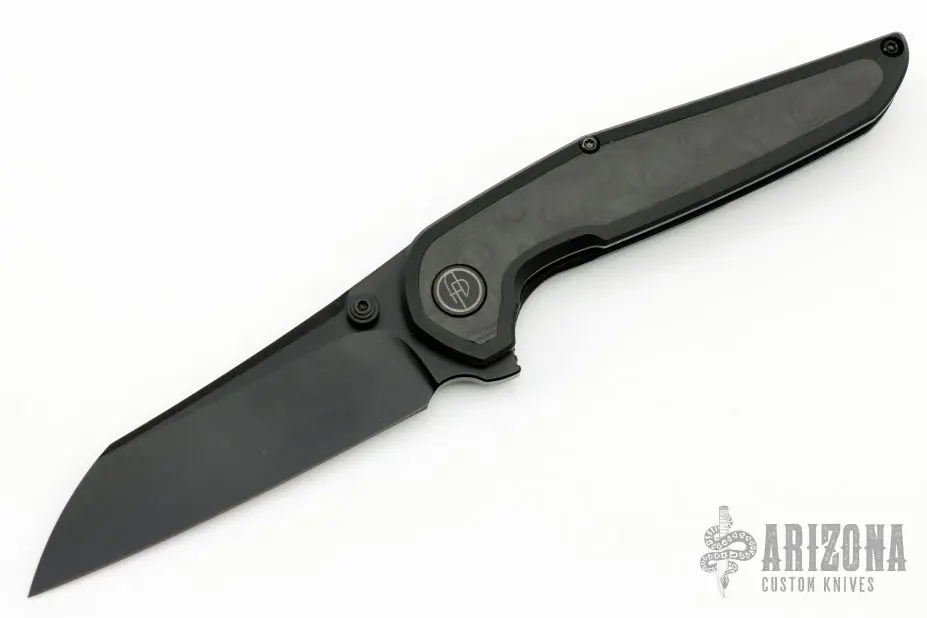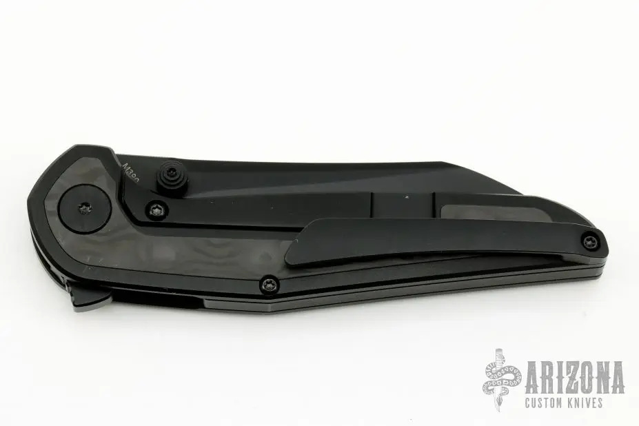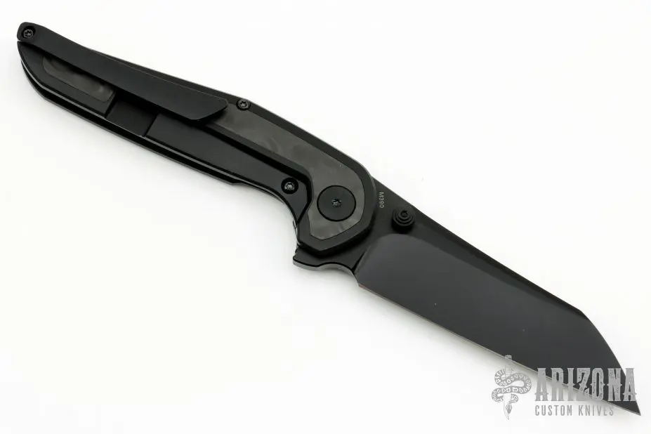 This Progeny features a black PVD blade with dual thumb studs and a notched flipper. The handle has a black PVD titanium frame with raindrop carbon fiber inlays, matching tip up pocket clip. Includes the original box. Excellent Condition.
