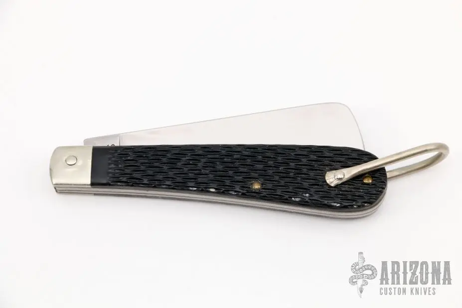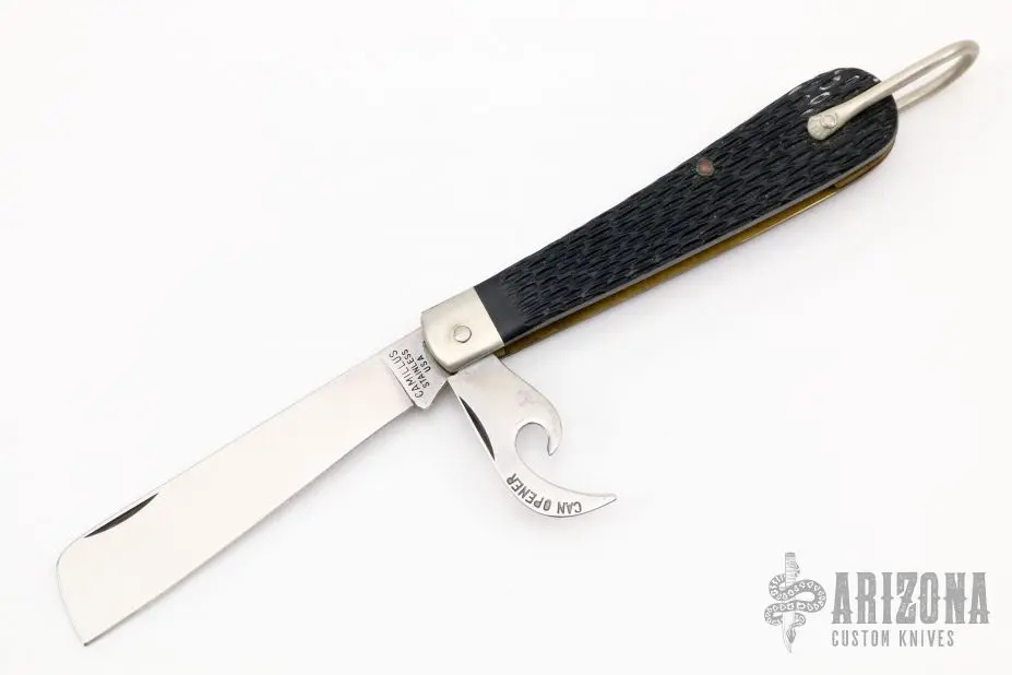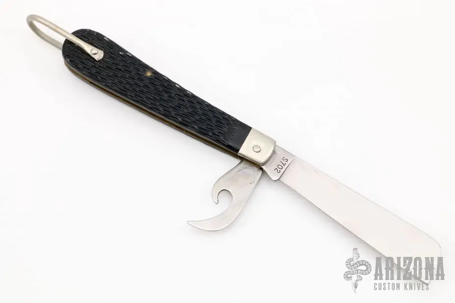This S702 Coast Guard Rope Knife from Camillus features a satin finish sheepsfoot style blade with nail nick. There is also a hawk bill can opener. The handle is comprised of stainless steel bolsters and jigged derlin covers over brass liners and stainless steel backspring. Stainless steel lanyard bail. Has some light scratches, otherwise excellent condition.