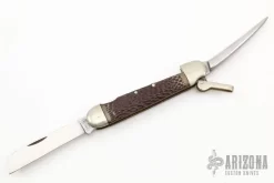 This Sailor’s Knife from Camillus features a satin finish sheepsfoot style blade with nail nick. There is also a marlin spike. ย The handle has nickel silver bolsters and jigged derlin covers over brass liners and stainless steel backspring. Nickel Silver lanyard bail. Scuffs, scratches and rust are visible. ย This knife would make a good user. ย