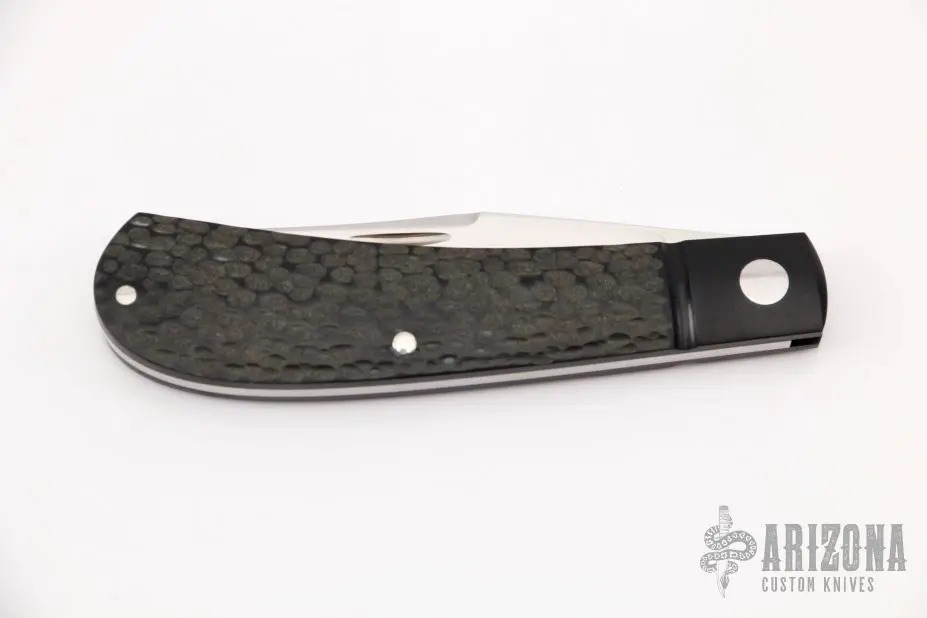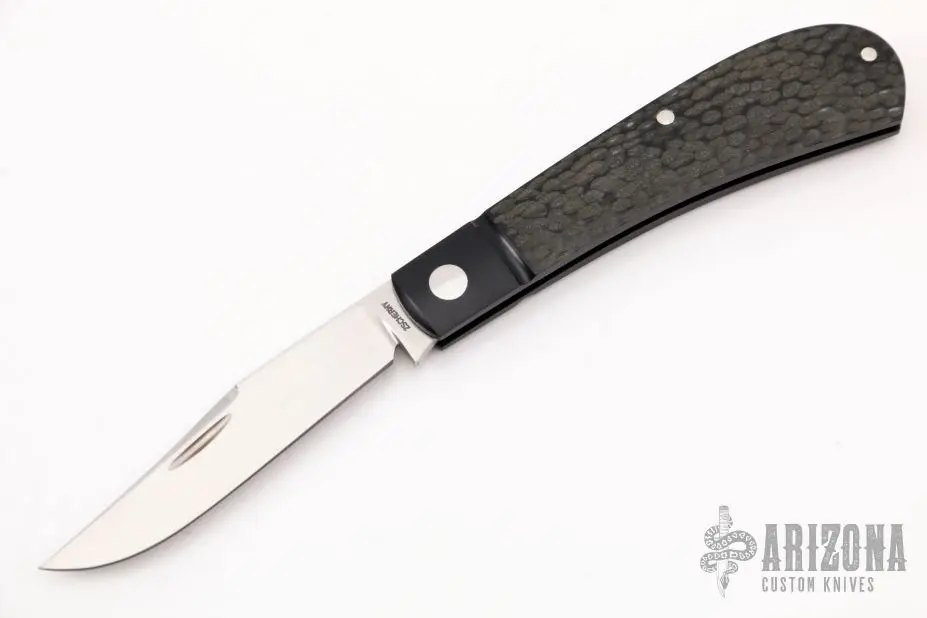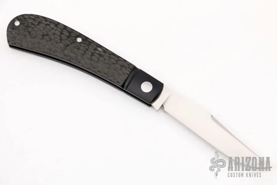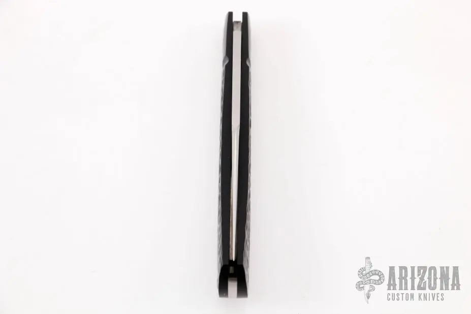 This Shadow Trapper by Mike Zscherny features a hand rubbed satin finish and nail nick. The handle has jigged black paper micarta covers, stainless steel spring. Half stop on blade, flush in all positions. New from maker!