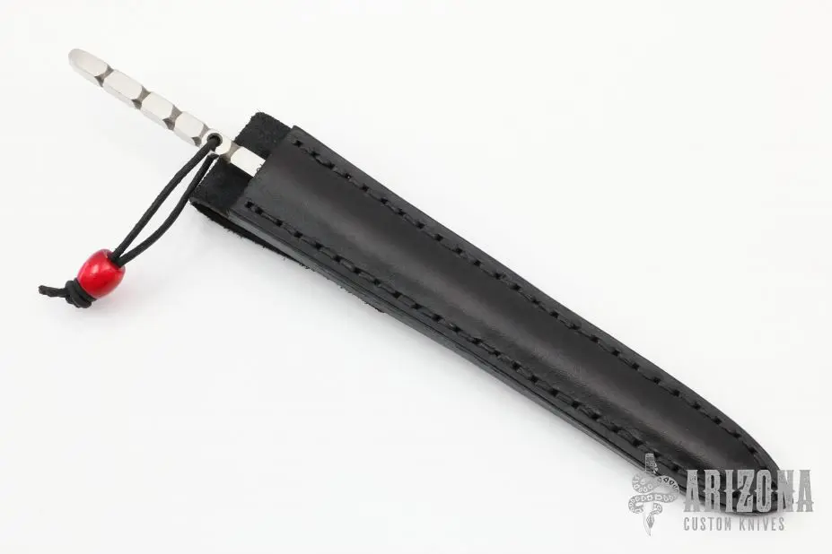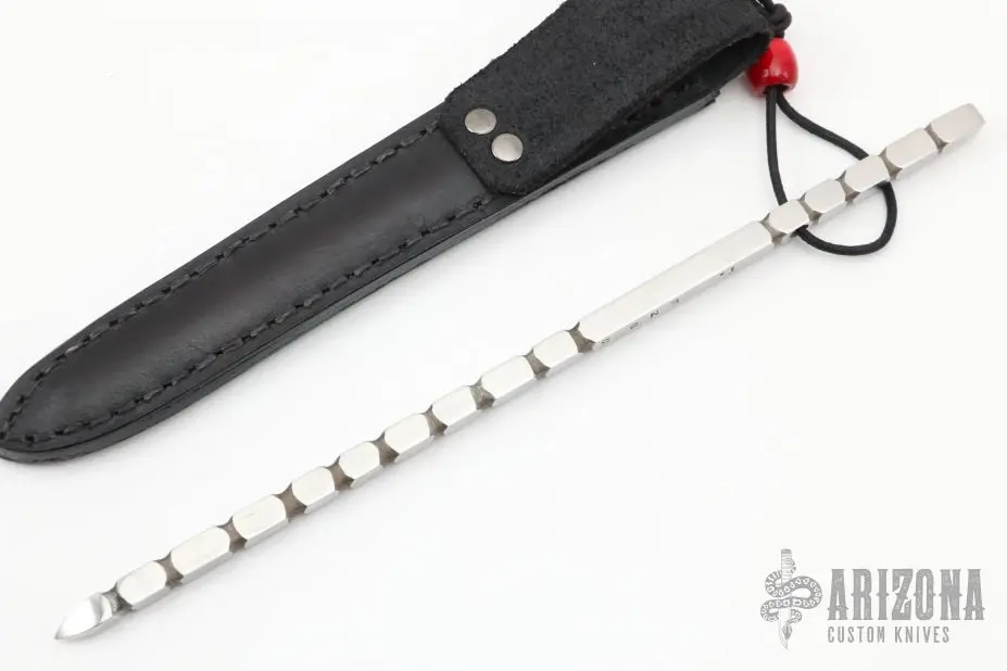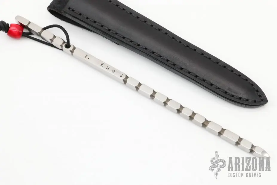 This Sheath Spike by TM Enos is dated 1992. Made from stainless steel. Comes with black leather sheath. Excellent condition.