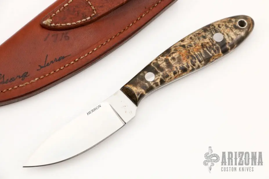 This Knife by George Herron features a mirror polished blade with .129″ blade stock and .856″ blade depth, full tapered tang construction. The handle has burl wood scales with stainless steel pins. Comes with a brown leather sheath. Has #2723 on the tang and sheath. Has some light staining on the blade, otherwise good condition.