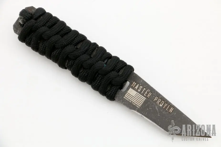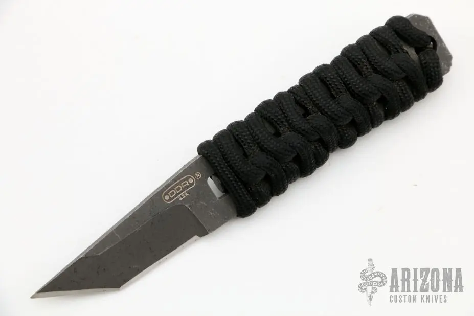This knife by Darrel Ralph features a black chisel ground blade with paracord wrap, .14″ blade stock and .774″ blade depth, full tang construction. Comes with kydex sheath. Has a couple light scuffs, otherwise excellent condition.