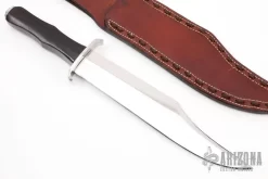 This small hunter by D Fisher features a hand rub satin finished blade with .102″ blade stock and .753″ blade depth, full tang construction. The handle has stag scales. Comes with a brown leather sheath. Has a few light scratches, otherwise good condition. Has zippered case.