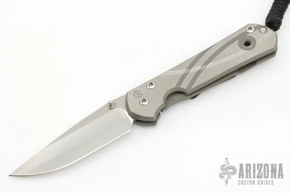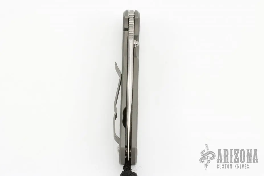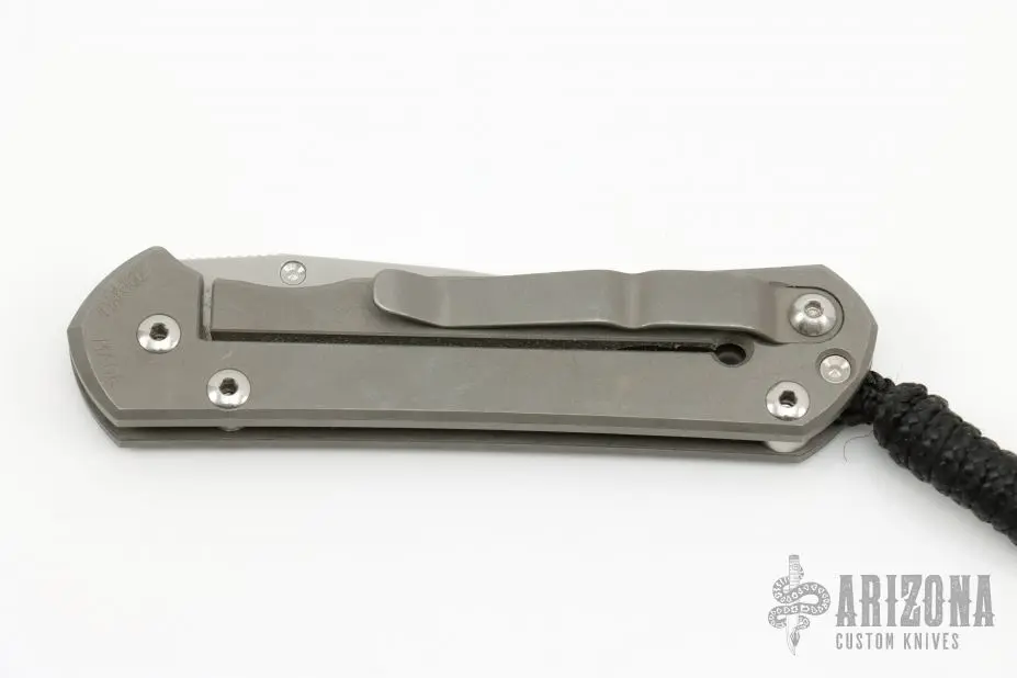 This Small Sebenza 21 by Chris Reeve Knives features a two-tone blade with tumbled flats and satin grinds, single thumbstud, and notched thumbest. The handle is titanium with engraving one side and bead blast titanium with bead blast titanium clip, tip up carry. Has titanium barrel spacer. Perfect detent, lockup and blade seating. Comes with original box, papers, and brown leather sheath. Dated June 27, 2013. Has a few scuffs, otherwise excellent condition.