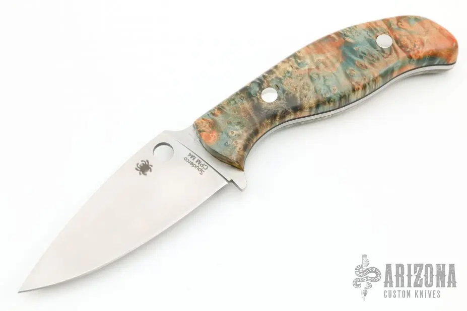 This Mule Team knife by Spyderco features a satin finished blade with skeletonized handle. This knife is intended to be finished by the buyer. This one has had custom box elder burl scales with black liners. Excellent condition.Β
