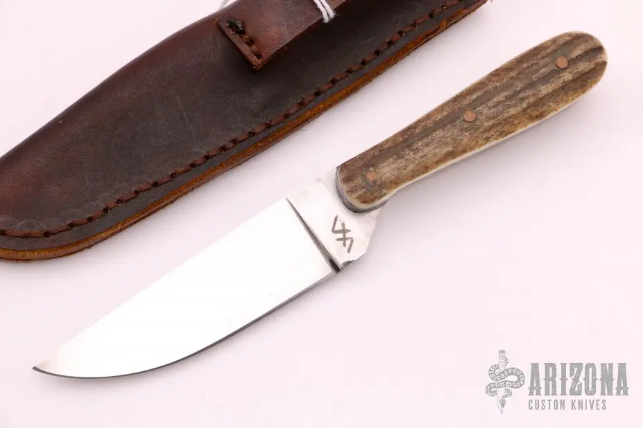 This knife by Mark Paluch features a hand forged satin finished blade with .169″ blade stock and 1.022″ blade depth, full tang construction The handle has stag scales with copper pins. Comes with a brown leather sheath. New from maker.