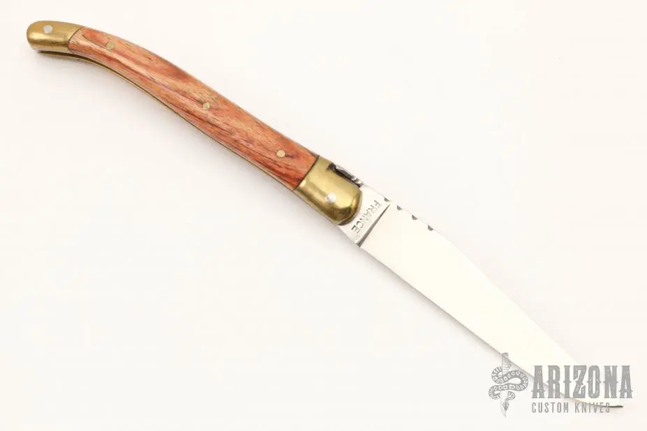 This knife features a mirror polished clip point blade with a single nail nick and a fileworked thumbrest. The handle features brass bolsters/liners over a steel backspring and wood covers. Fileworked backspring. Excellent Condition.