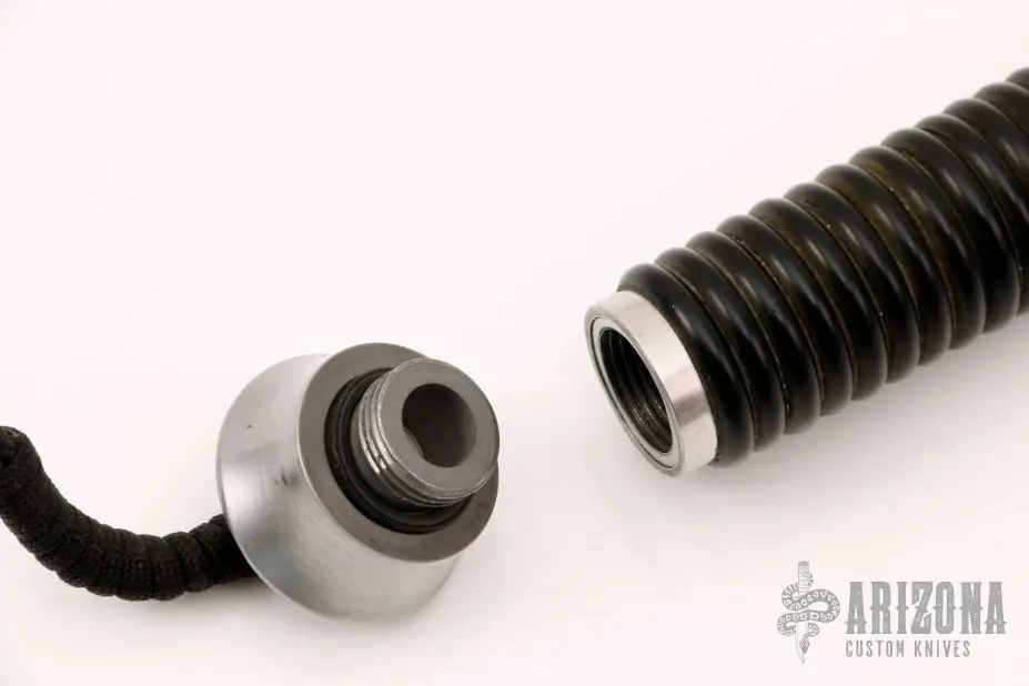 This Survival Bowie by Jim Thompson features a bead blasted blade with sawteeth on the spine, .243″ blade stock and 1.983″ blade depth, hidden tang construction. The handle has a stainless steel guard and removable butt cap, stainless steel hollow handle with black ribbed grip. Has some light scratches and stains, otherwise good condition.