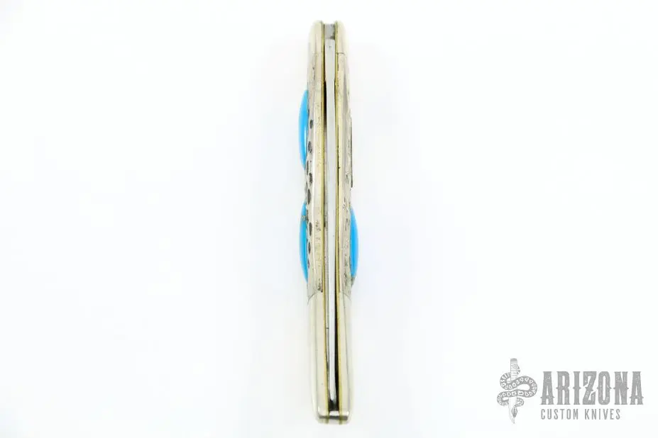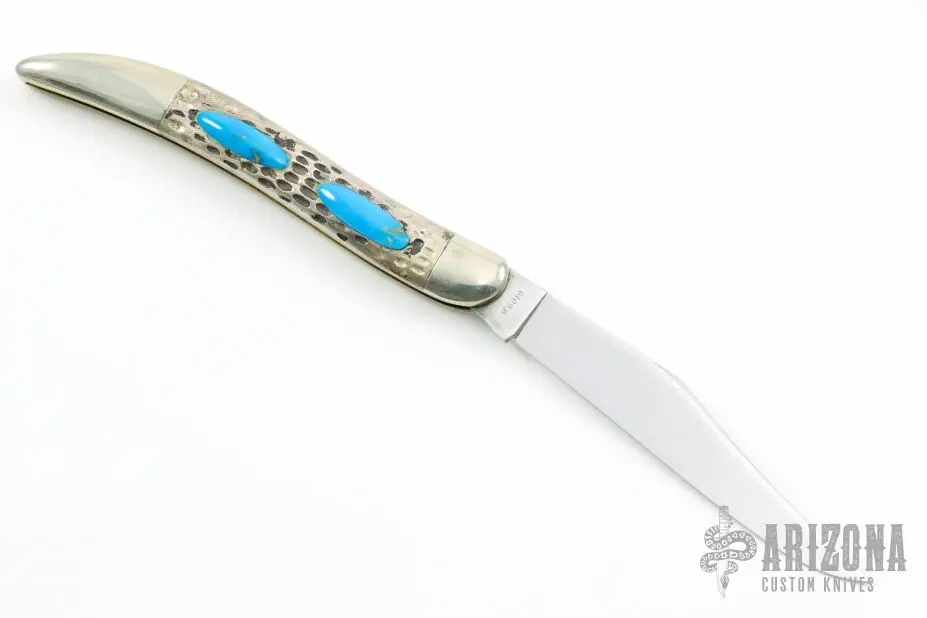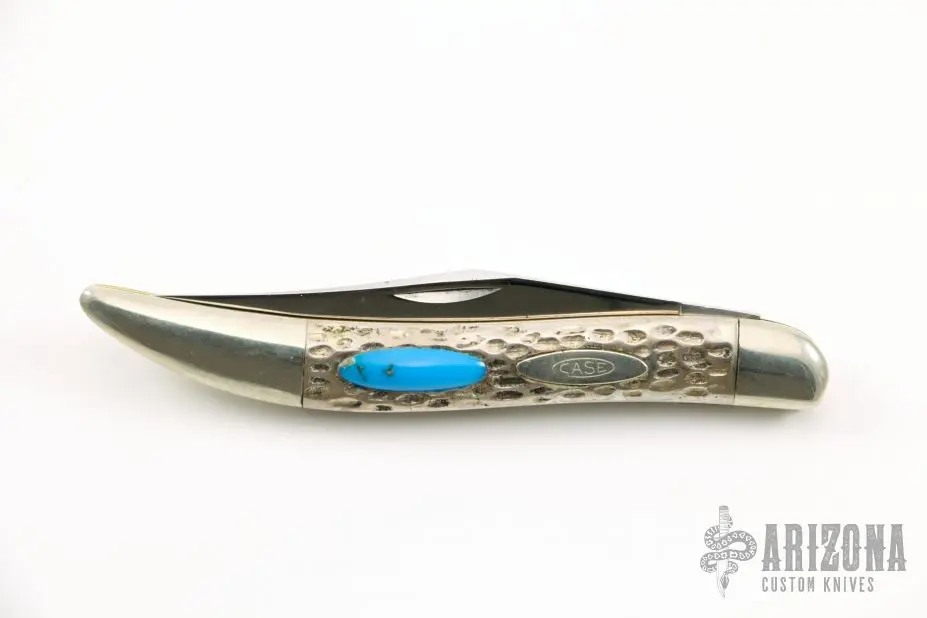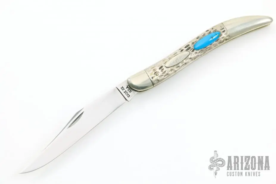 This Toothpick by Case Knives features polished blade with nail nick. The handle has nickel silver bolsters and cap, jigged silver covers, brass liners, blue overlays and a stainless backspacers. This knife shows signs of use otherwise is in good working condition.