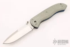 This Urban Combat Linerlock folder by Jim Burke features a spear point hand rub satin finished blade with dual thumbstuds and a notched thumbrest. The handle has silver twill scales, orange peel finished and anodized titanium liners, tip down bead blast titanium clip, up/down reversible. Nice lockup, and blade seating. Excellent condition.