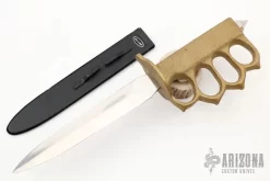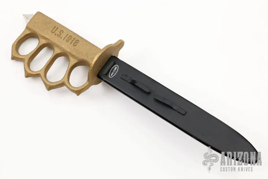 This is a Reproduction WWI L.F & C. trench knife made in Taiwan. Cast Brass handle with U.S. 1918 stamped. Has a polished blade with unsharpened edges. Comes with original box and sheath. Excellent condition.Β