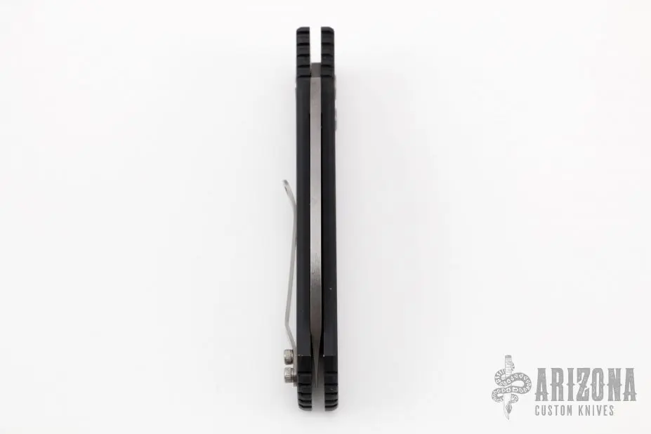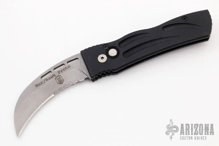 This War/Hawk Prototype by Rob Dalton features a bead blasted partially serrated blade and black aluminum handle. Strong coil spring. Tip up titanium clip. Excellent condition.