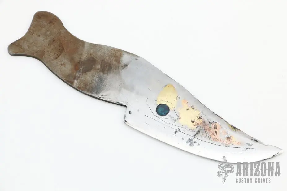 Shape of whale. Etched blade. Copper and bronzed forged into the blade. .094″ Blade Stock. 1.582″ Blade Depth. New from maker.