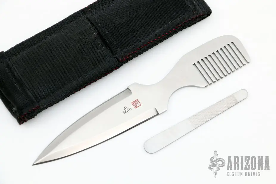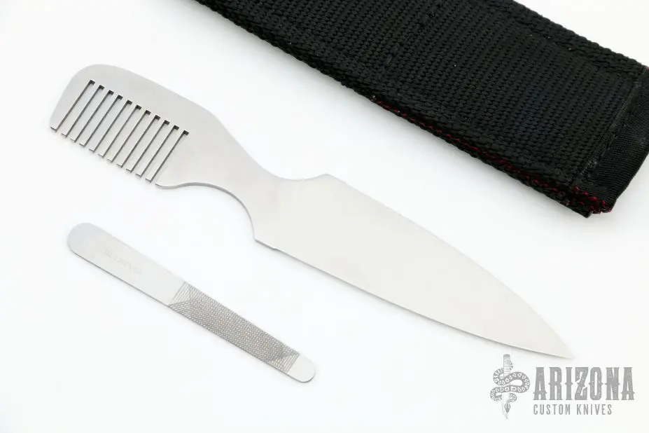 This “Wild Hair” comb dagger features a chisel grind double edged blade. The handle is a comb. In the sheath it appears to be just a comb. Black nylon sheath with nail file. Excellent condition.